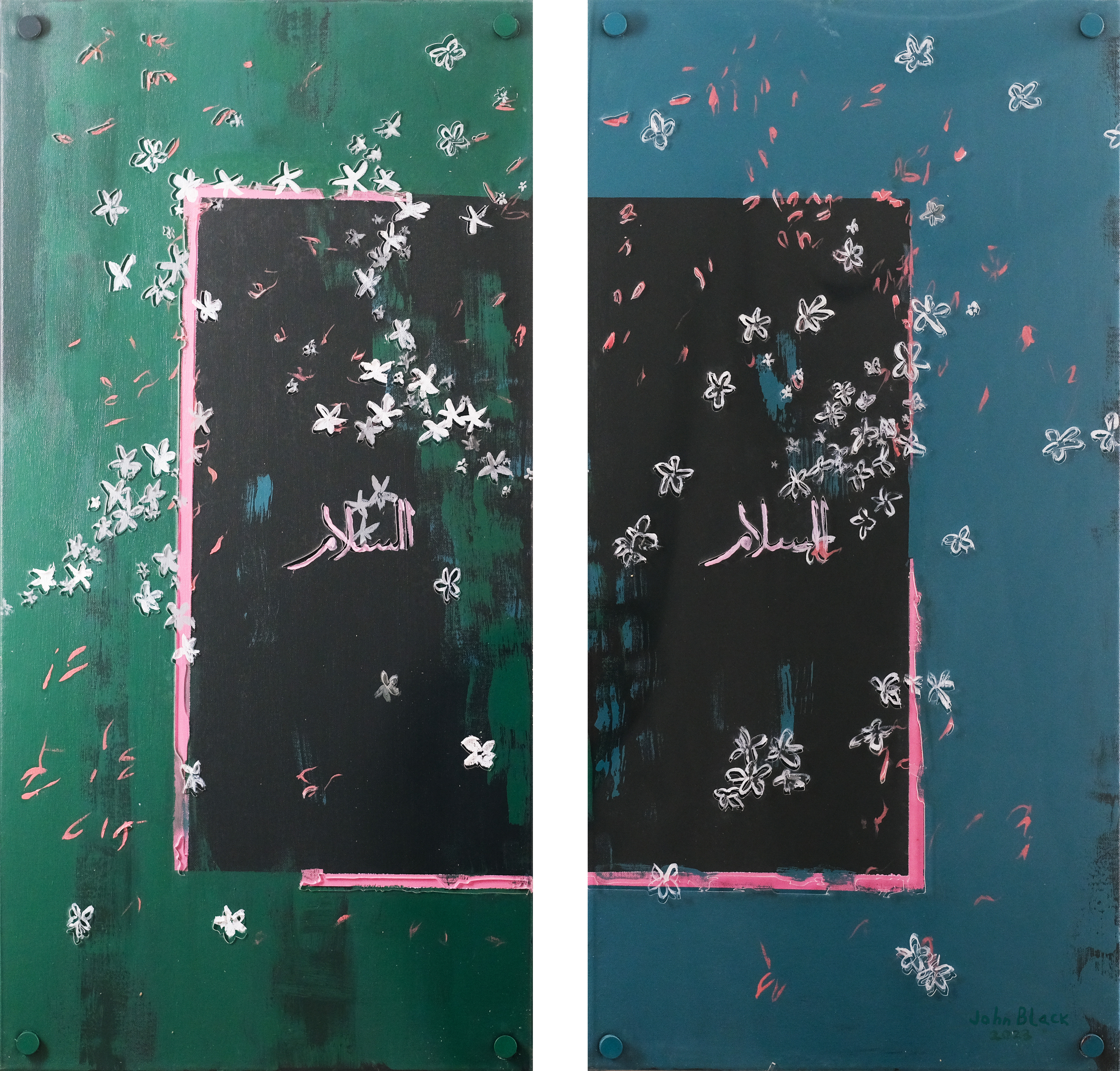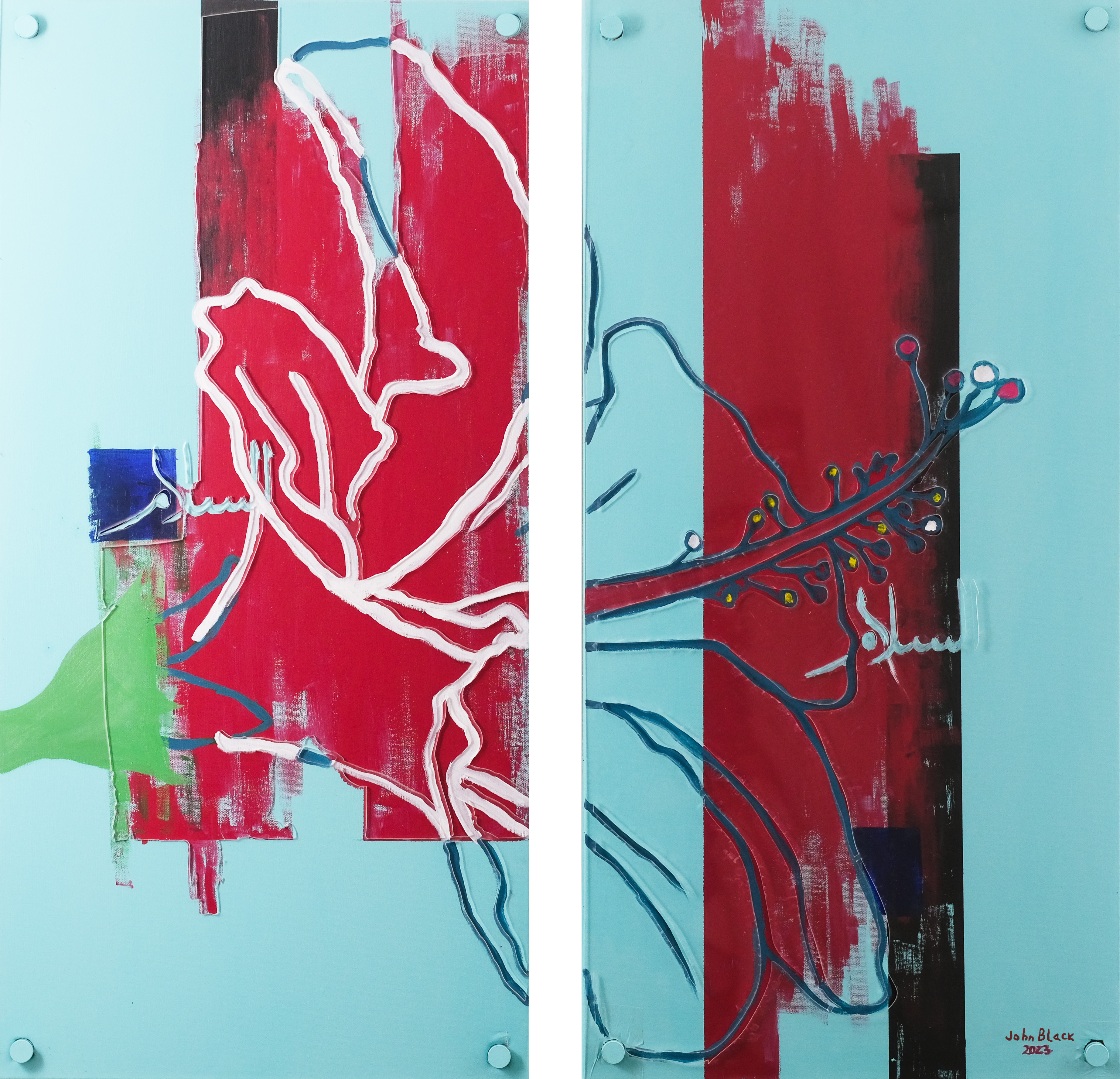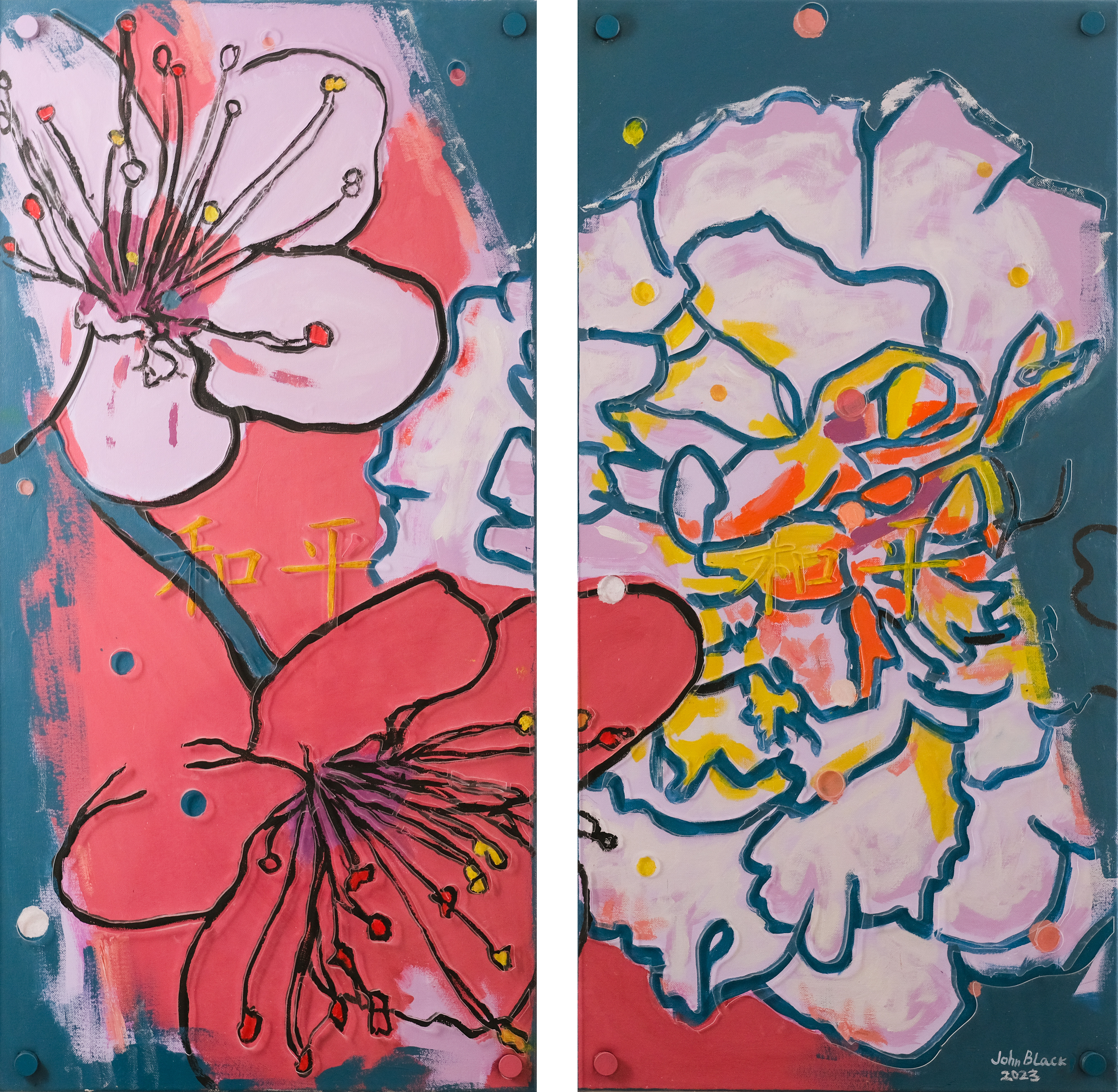 In this work from the Peace series, John Black reflects on the fragile balance between nations through the symbolic language of their national flowers. The plum blossom — emblem of China — and the peony — symbol of Taiwan — are placed in visual dialogue, sharing a single pictorial space yet divided by a subtle boundary.<br />
