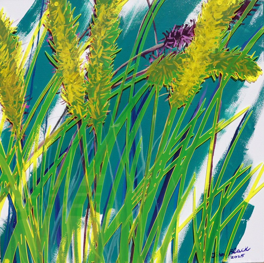 In Spikes, John Black transforms the familiar motif of wild grasses into a striking meditation on rhythm and structure. The vertical thrust of the painted stalks, executed in vivid greens and yellows, is amplified by the presence of laser-cut acrylic overlays that echo and fracture the gesture of the brush.<br />
