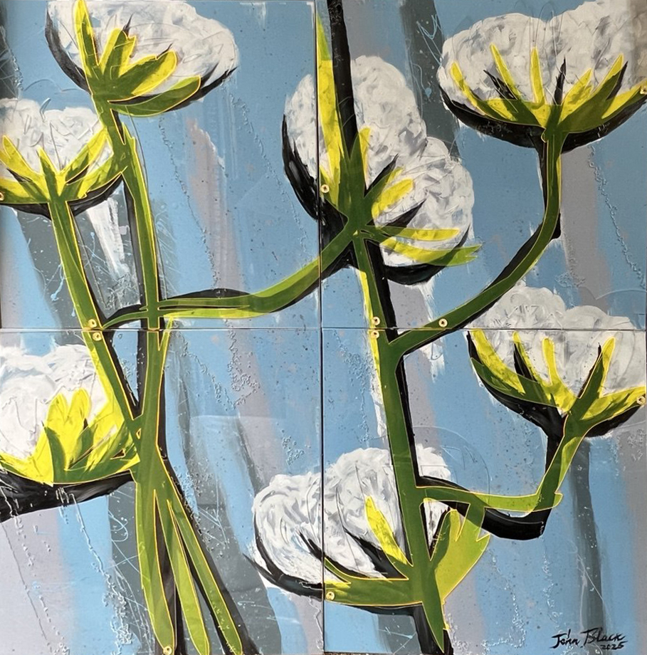In Cotton Sky, John Black continues his philosophical exploration of the square — as both a geometric form and a symbol of harmony and containment. Four canvases merge into a single unified composition, where the branches of cotton plants rise toward an expansive, cloud-colored sky.<br />